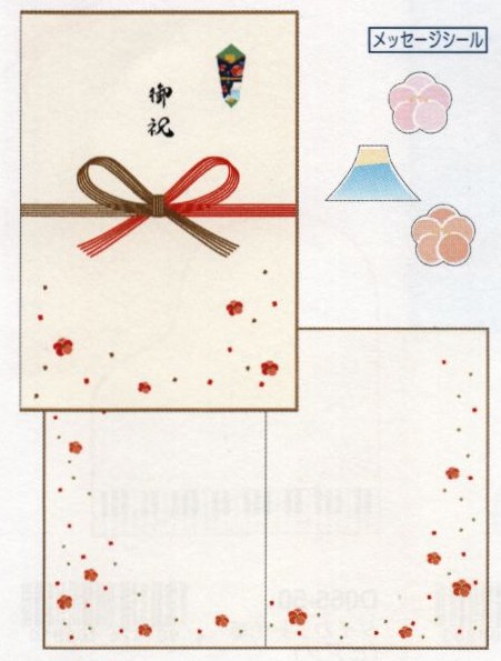熨斗紙をモチーフにしたデザインの2つ折り色紙です。花、富士をデザインした小さなメッセージシールが24枚付属しています。