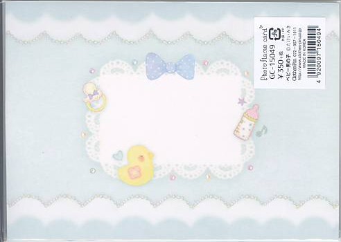 横長のL判写真が1枚入る立てて飾れるフォトフレームカード(絵柄入り封筒付)です。フレーム部分に絵柄が立体的になっています。カード中面にメッセージ記入欄有。