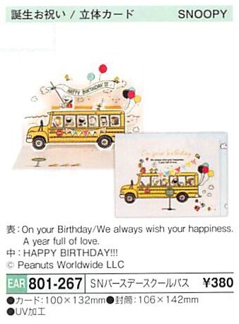 誕生日祝いにご利用戴けるスヌーピーのポップアップ・カードです。UV加工あり。